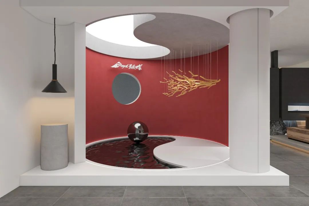 整個空間以中國紅為基色創(chuàng)新出亞紅色和深咖色為主基調,再配合復合輕紋的標識與線性光輪廓,大氣高雅的格調躍然而出。傳達出了君匠世家藝術涂料致力創(chuàng)新國潮健康美學家居的品牌理念。