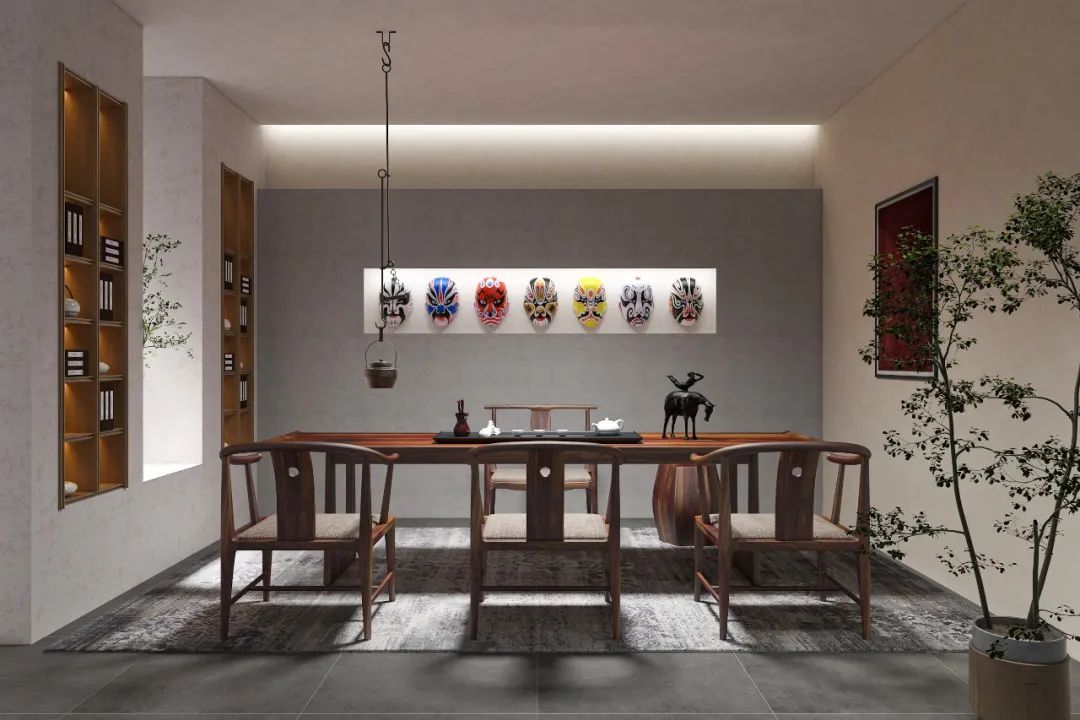 京劇被稱之為“國粹”,是中華民族寶貴的文化遺產,也是戲曲藝術中最具特色的一個藝術門類,茶室區(qū)域采用的新中式設計風格中植入了表現(xiàn)人物性格的主要元素,恰如其分地凸顯出君匠世家藝術涂料的高端定制概念。