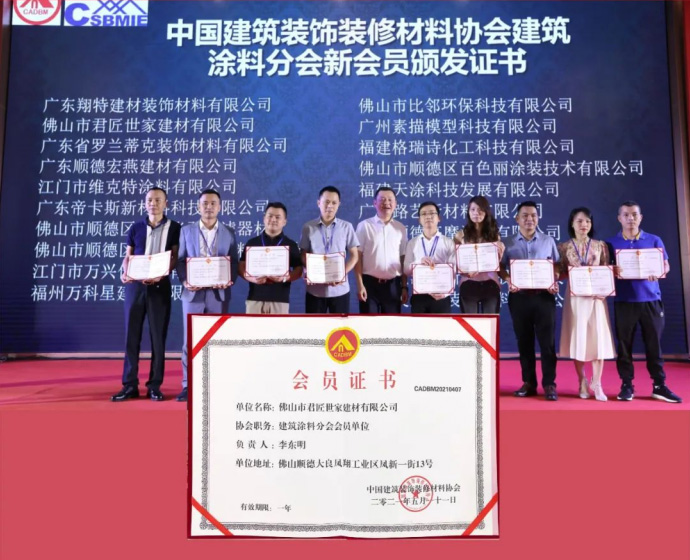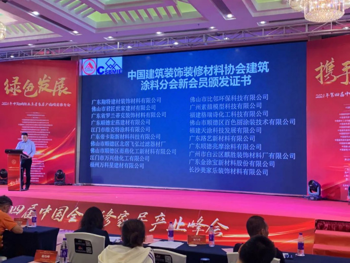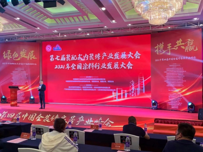 2021年5月18日,由中國建筑裝飾裝修材料協(xié)會主辦的“綠色發(fā)展 攜手共贏”第四屆中國全裝修家居產(chǎn)業(yè)峰會在廣東佛山盛大召開。君匠世家藝術(shù)涂料作為建筑涂料分會會員單位代表出席了本次會議,與中國建筑裝飾裝修材料協(xié)會的各大會長,齊聚一堂,共同迎來這場交流盛會。此次大會旨在貫徹落實(shí)國務(wù)院《關(guān)于加快建立健全綠色低碳循環(huán)發(fā)展經(jīng)濟(jì)體系的指導(dǎo)意見》文件精神,推行產(chǎn)品綠色設(shè)計(jì),建設(shè)綠色制造體系,加強(qiáng)再制造產(chǎn)品認(rèn)證與推廣應(yīng)用,全方位推進(jìn)我國建筑裝飾裝修材料行業(yè)的綠色發(fā)展,加快推進(jìn)裝配式的裝修發(fā)展。
