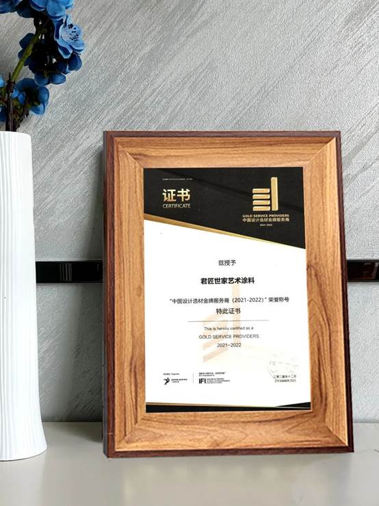 君匠世家藝術(shù)涂料榮獲“中國設(shè)計(jì)選材金牌服務(wù)商”獎(jiǎng)項(xiàng)。能在眾多行業(yè)中脫穎而出,代表著設(shè)計(jì)行業(yè)對(duì)君匠世家藝術(shù)涂料的品牌實(shí)力、產(chǎn)品品質(zhì)以及經(jīng)銷商服務(wù)的高度認(rèn)可。