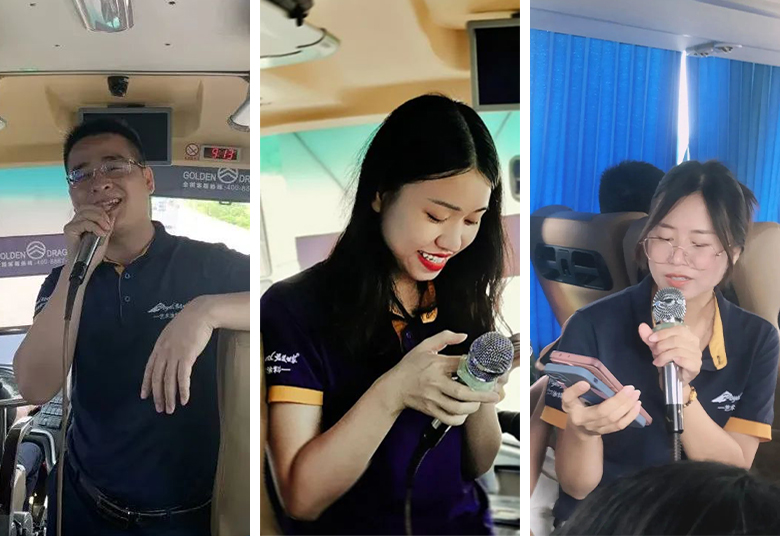 在行駛的大巴上,同事們歡聲笑語不斷,個(gè)個(gè)大展身手,唱歌、相聲、小品、笑話等才藝表演,為旅途增添了不少的樂趣。