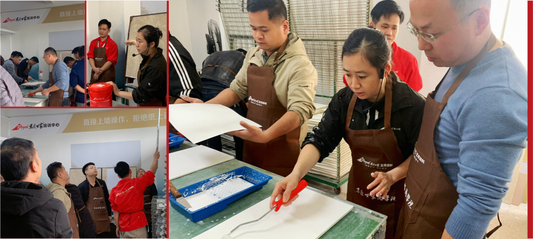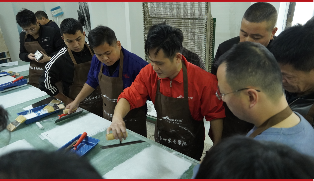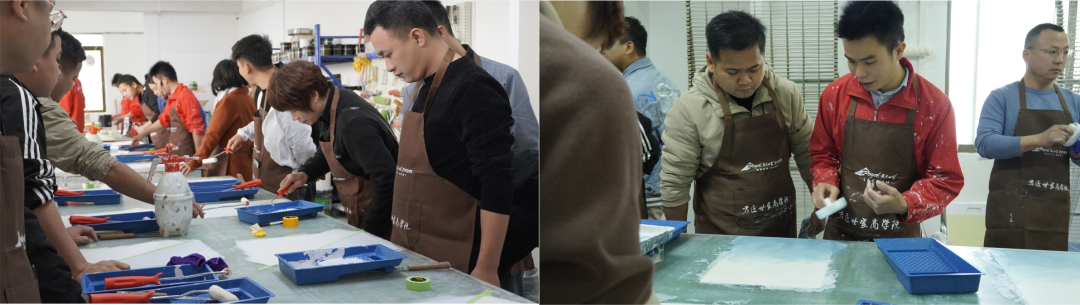 白天,君匠世家高級(jí)工藝師手把手帶領(lǐng)教學(xué)的同時(shí)也在不斷活躍課程的氣氛,帶領(lǐng)學(xué)員學(xué)習(xí)君匠世家藝術(shù)涂料各種工藝,對(duì)行業(yè)的涂裝知識(shí)也是傾囊相授。對(duì)于產(chǎn)品的施工流程、注意事項(xiàng)等各種要點(diǎn)逐一講解,學(xué)員提出的疑惑現(xiàn)場(chǎng)提問(wèn)給予專業(yè)性解答!