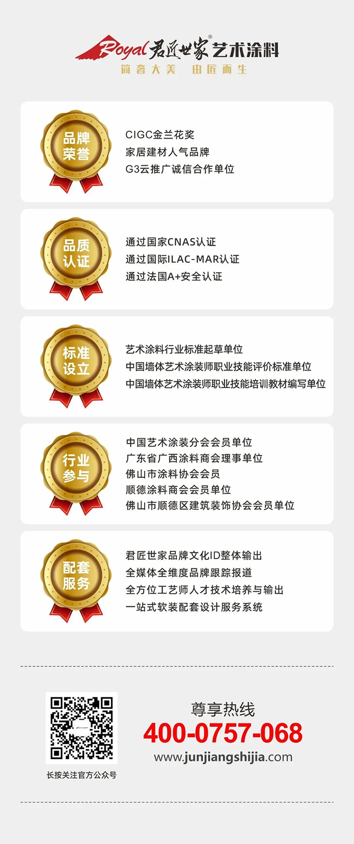 君匠世家成立于2012年,傳承東方皇家漆藝精髓,融合世界優(yōu)質(zhì)裝飾涂料,集產(chǎn)品研發(fā)生產(chǎn)、配套設計、銷售為一體的國際品牌。從創(chuàng)立之初,君匠世家秉承“傳承宮廷技藝,匠心締造卓絕”的祖訓。將藝術(shù)涂料的傳承與創(chuàng)新工藝做到精妙絕倫,巧奪天工。2020年,君匠世家參與制定了中國《建筑用厚涂型藝術(shù)涂料》等工藝標準。此外,榮獲《藝術(shù)涂料行業(yè)標準主要起草單位》、《中國墻體藝術(shù)涂裝師職業(yè)技能標準單位》等榮譽。2023年入選中國涂料品牌50強。超千款潮流精品,超千種色彩應用,一站式服務,為全國培養(yǎng)優(yōu)質(zhì)人才,讓經(jīng)銷商輕松創(chuàng)業(yè)!