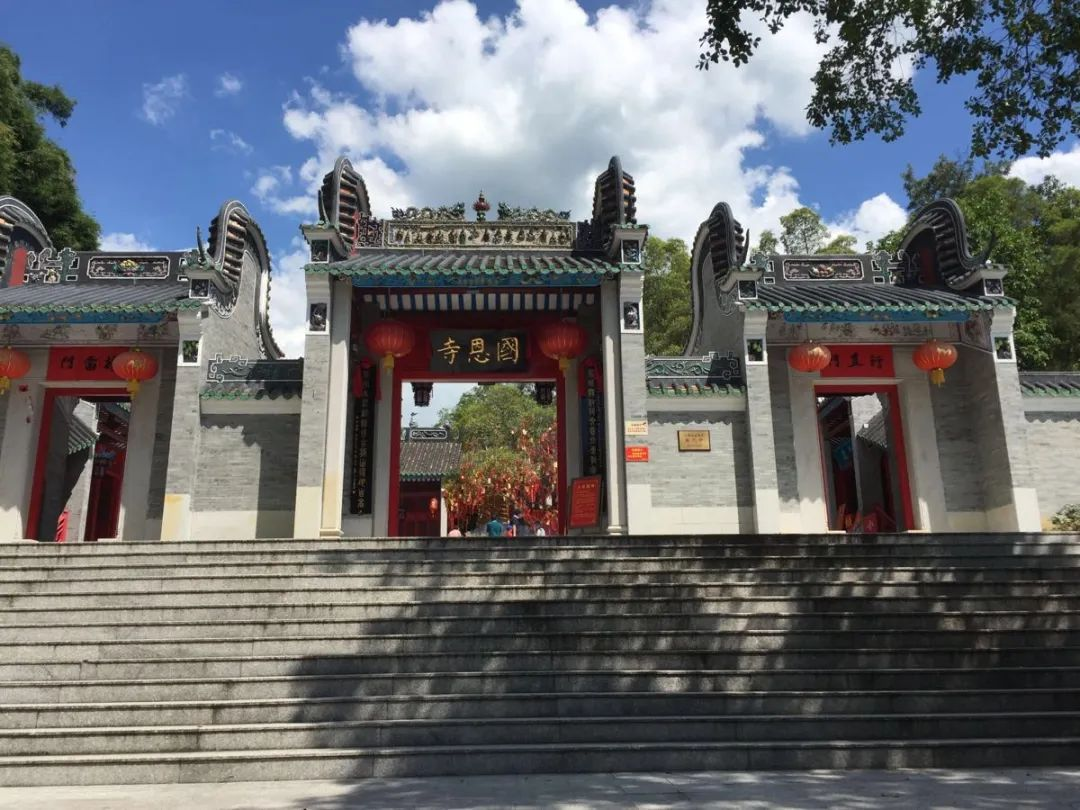 進入正門,即可看到頗具嶺南建筑特色的國恩寺門口,古色古香,林木繁盛,一下便能把人的心境拉入平和的狀態(tài),這也許便是建筑與環(huán)境的相結(jié)合所營造出來的意境之美,賦予文化的內(nèi)涵,讓人身心愉悅,享受清幽、文化的浸潤。