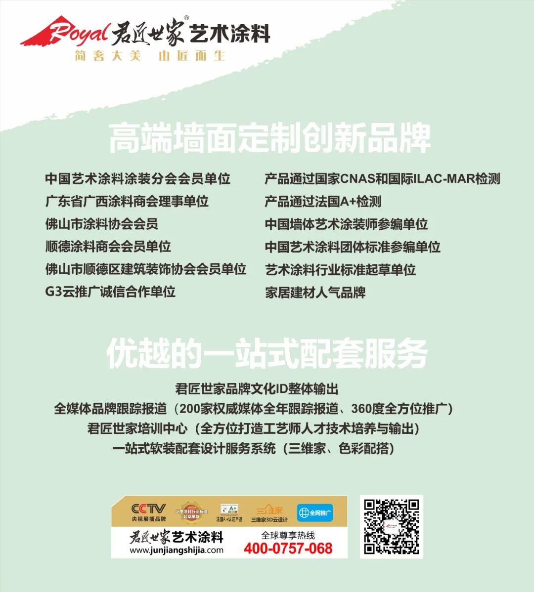 君匠世家作為藝術(shù)涂料行業(yè)標(biāo)準(zhǔn)起草單位,從成立初始即以嚴(yán)格的品質(zhì)管控和技術(shù)創(chuàng)新為依托,洞察國際國內(nèi)流行趨勢(shì),將純正的產(chǎn)品帶給國人,致力于將輕奢體驗(yàn)、潮流時(shí)尚、健康環(huán)保的理念完美詮釋于多樣化的產(chǎn)品中!