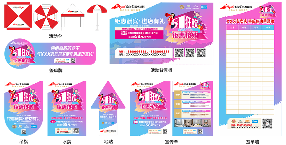 物料設計配套:宣傳單、展架海報、地貼、吊旗、水牌、文化墻、簽單牌、簽單墻等。